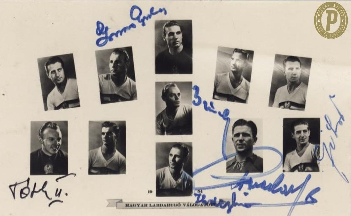 A magyar válogatott vb-tablója aláírásokkal (Buzánszky Jenő, Czibor Zoltán, Grosics Gyula, Hidegkuti Nándor, Puskás Ferenc, Tóth II József) (fotó: Puskás Intézet)