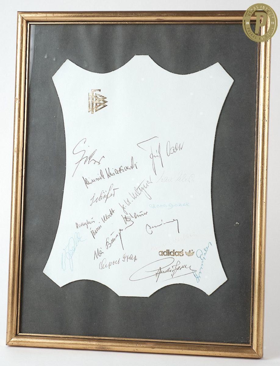 A döntő 40. évfordulóján a futballisták által dedikált Adidas bőrlap keretezve (fotó: (fotó: Puskás Intézet/Grosics-hagyaték)