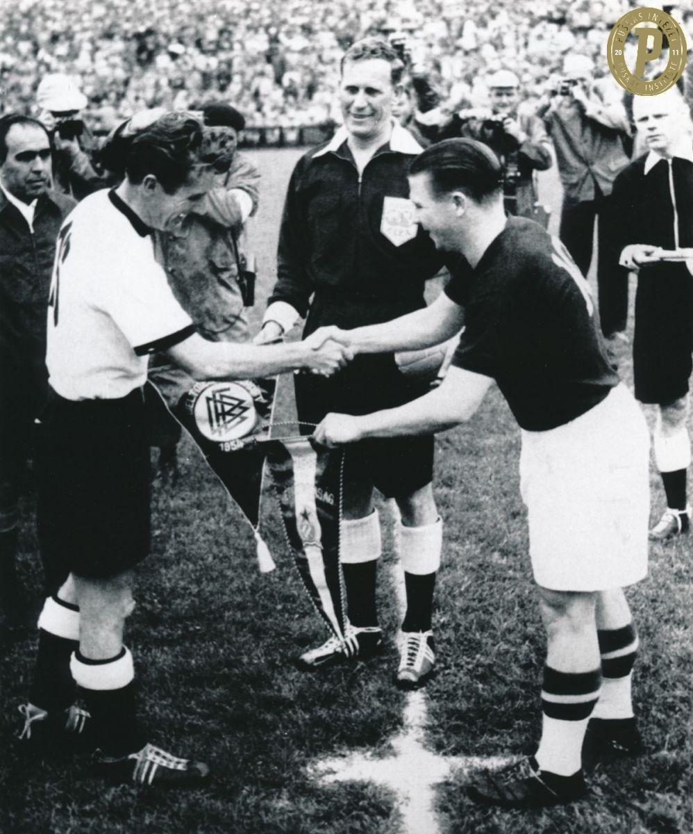 Puskás Ferenc és Fritz Walter vezeti ki a kezdőcsapatokat a vb-döntőre (fotó: Puskás Intézet/Puskás-hagyaték)