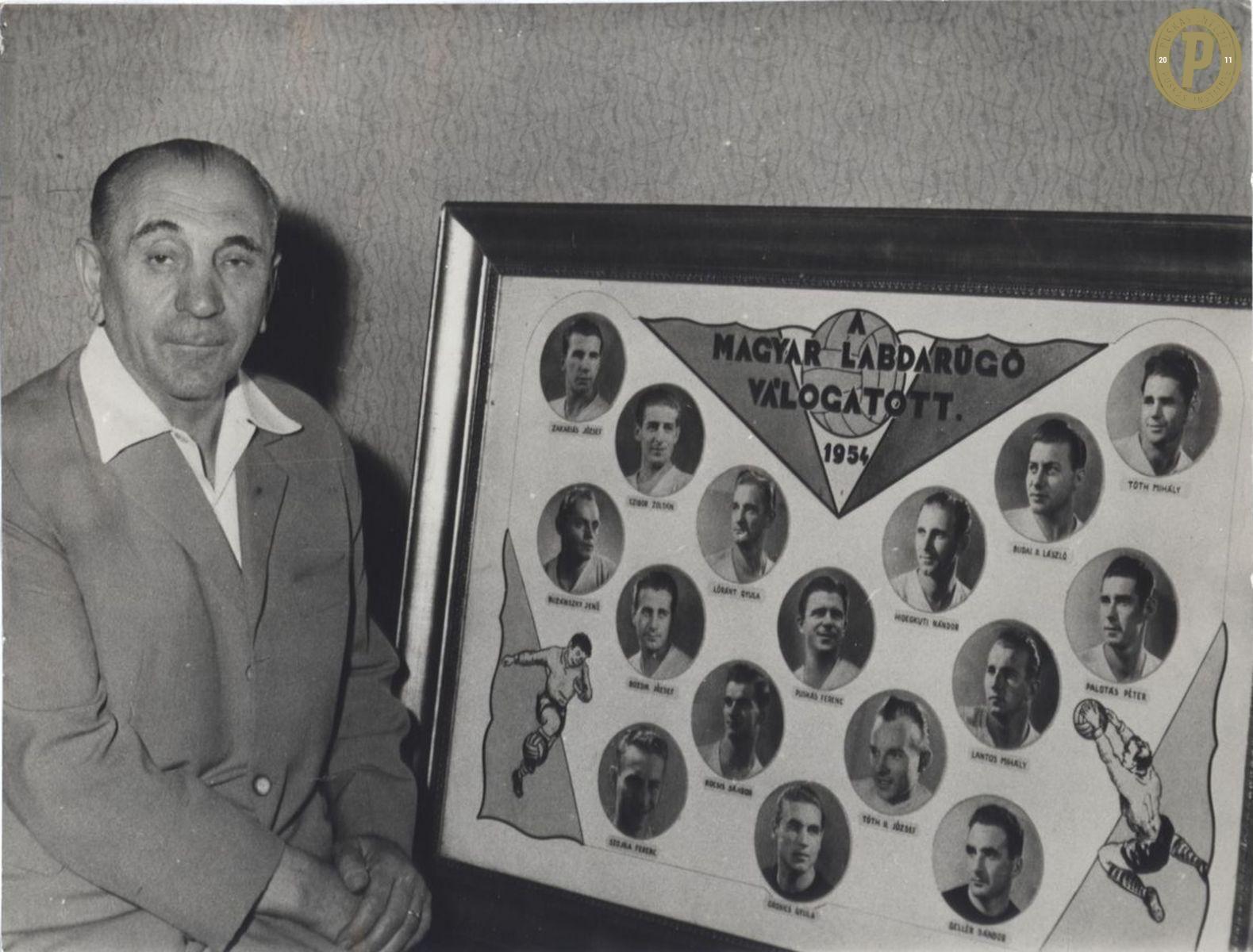 Sebes Gusztáv, a magyar szövetségi kapitány a válogatott tablójával (fotó: Puskás Intézet/Sebes-hagyaték)