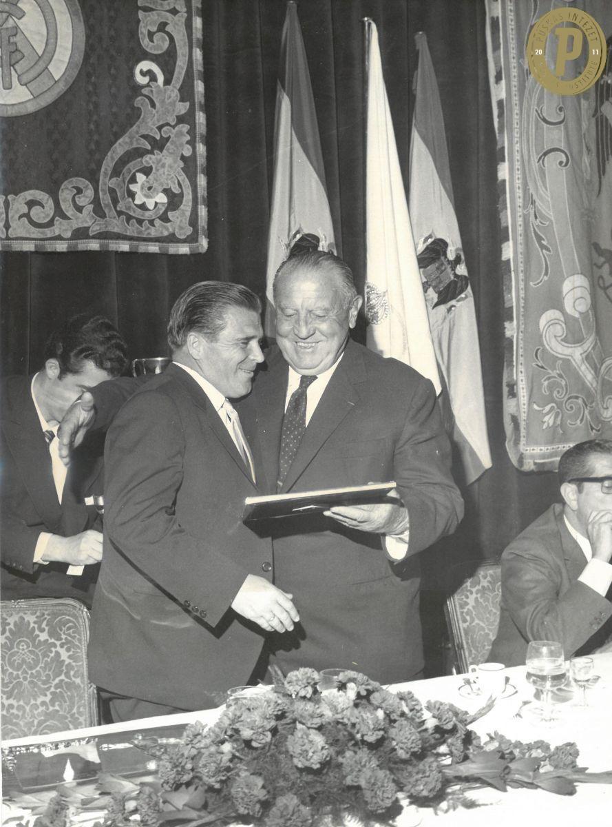 Puskás Ferenc és Santiago Bernabéu, a Real Madrid elnöke 1969-ben, Puskás búcsúvacsoráján. (Fotó: Puskás Intézet)