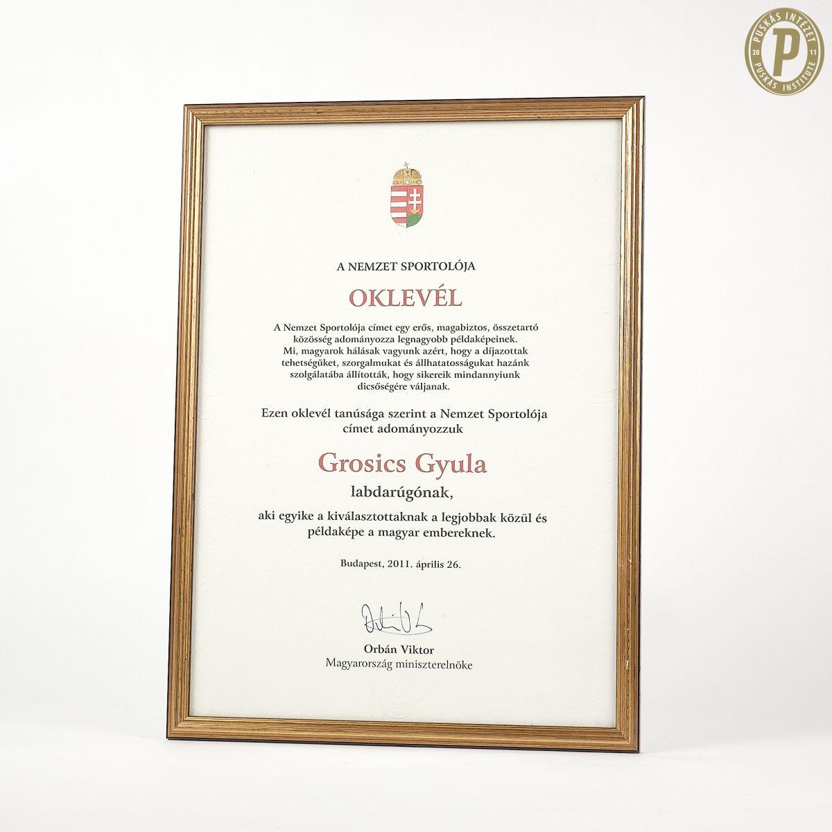 Grosics Gyula Nemzet Sportolója oklevele. (Fotó: Puskás Intézet)