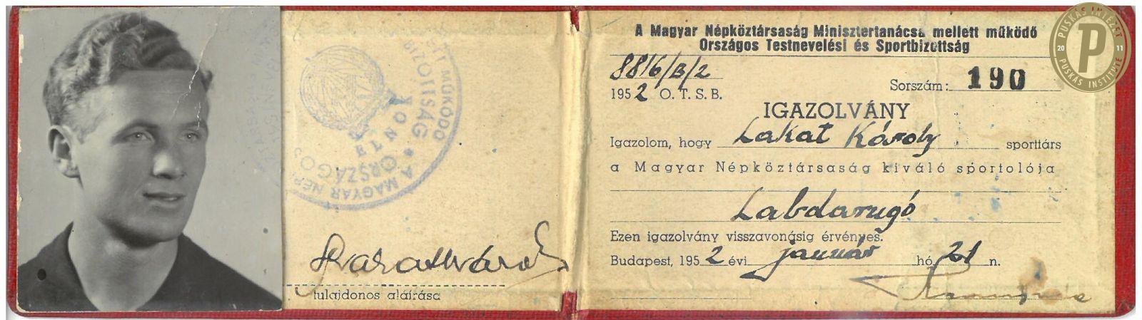 Lakat Károly kiváló sportolói igazolványa, amely nemrég került a Puskás Intézet birtokába. (Fotó: Puskás Intézet)