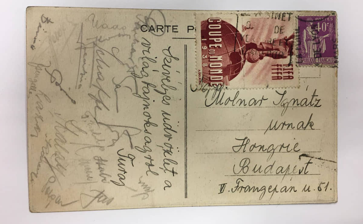 Képeslap az 1938-as világbajnokságról a magyar válogatott tagjainak aláírásával (Puskás Intézet)
