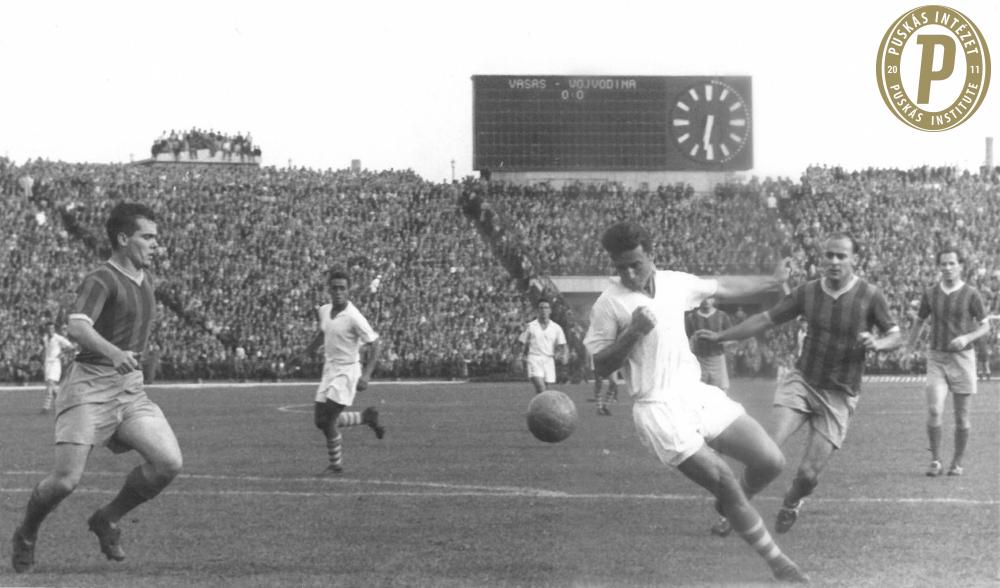 Berendy Pál (balról az első) a Vasas SC–FK Vojvodina (4–0) Közép-európai Kupa-döntő első felvonásán a Népstadionban 1957. július 28-án (fotó: Puskás Intézet)