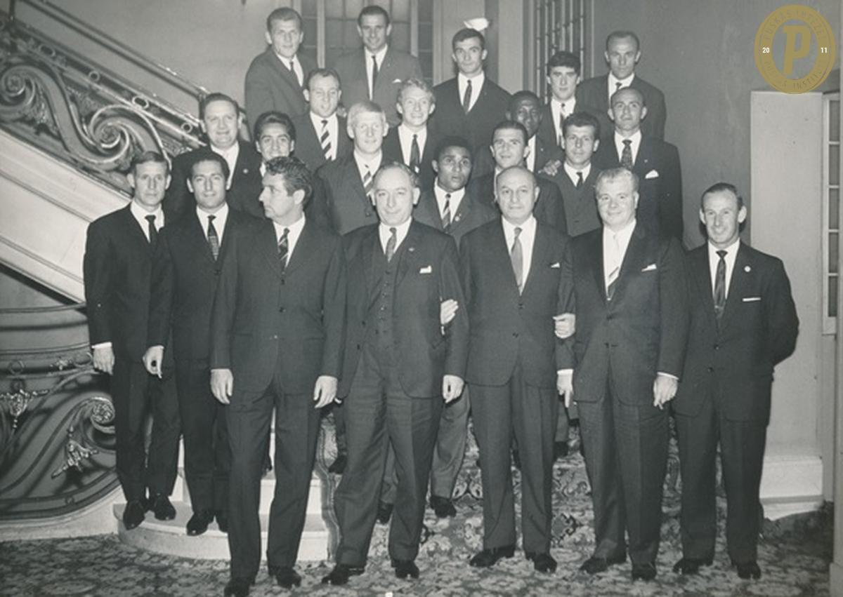 Eusébio és Puskás Ferenc (a harmadik sorban balról a negyedik és őtödik) a világválogatott tagjaival. (Fotó: Puskás Intézet)