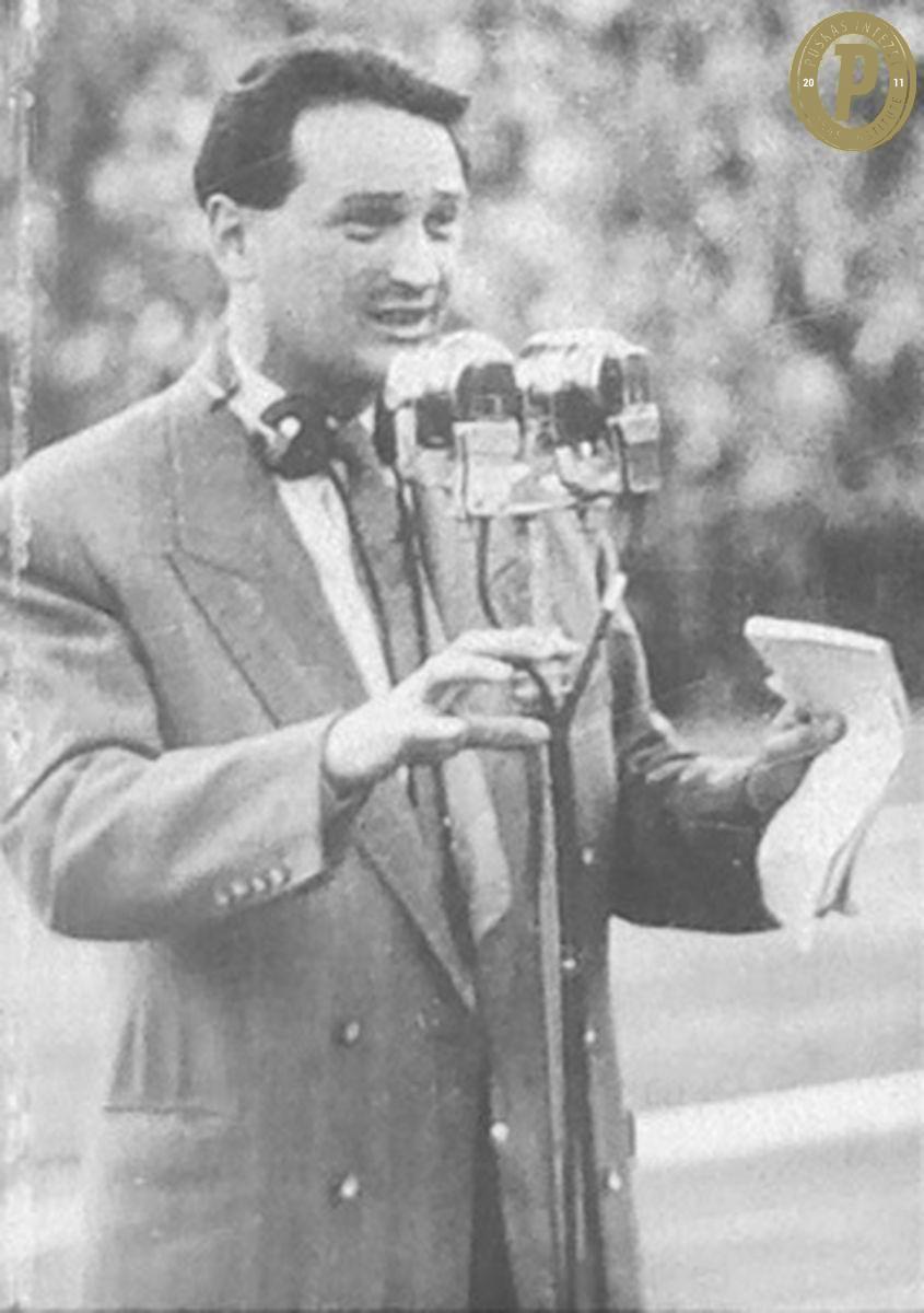 Szepesi György közvetít az 1954. május 23-i Magyarország – Anglia 7–1-es mérkőzésen. (Fotó: Puskás Intézet)