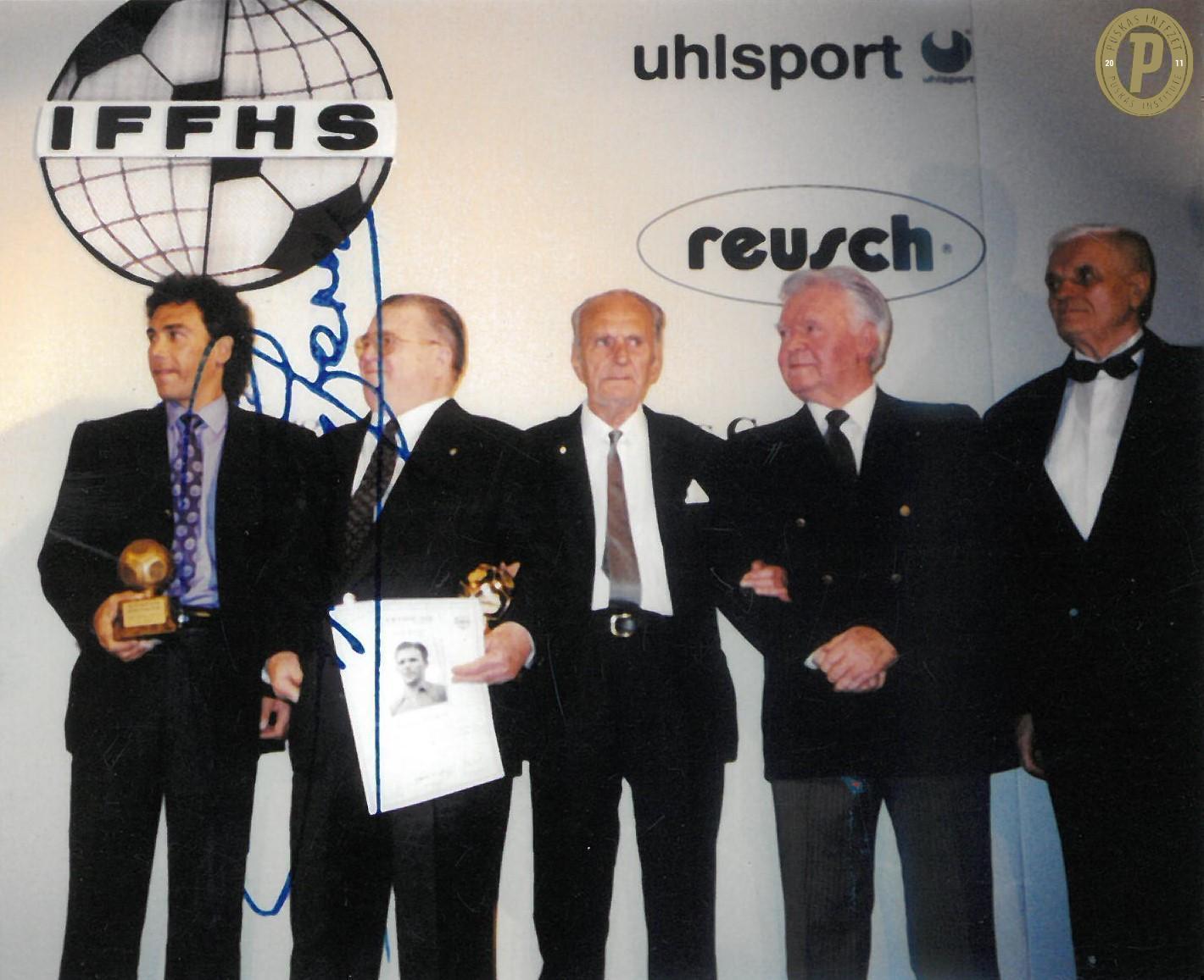 Hugo Sánchez, Puskás Ferenc, Zsengellér Gyula, Szusza Ferenc és Deák „Bamba” Ferenc 1997. január 20-án az IFFHS müncheni gáláján. (Fotó: Puskás Intézet)