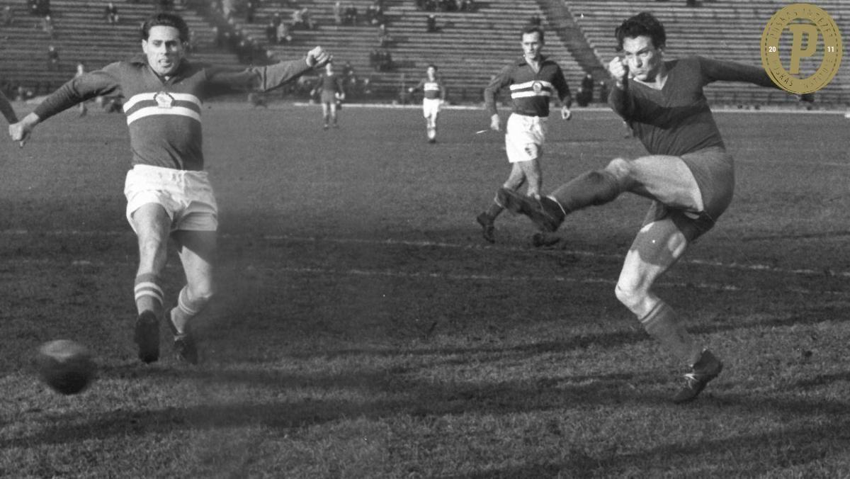 Palicskó Tibor és Szilágyi Gyula az 1955. december 4-i Bp. Vasas–Bp. Honvéd (1–1) NB I-es bajnokin a Népstadionban (fotó: Puskás Intézet)