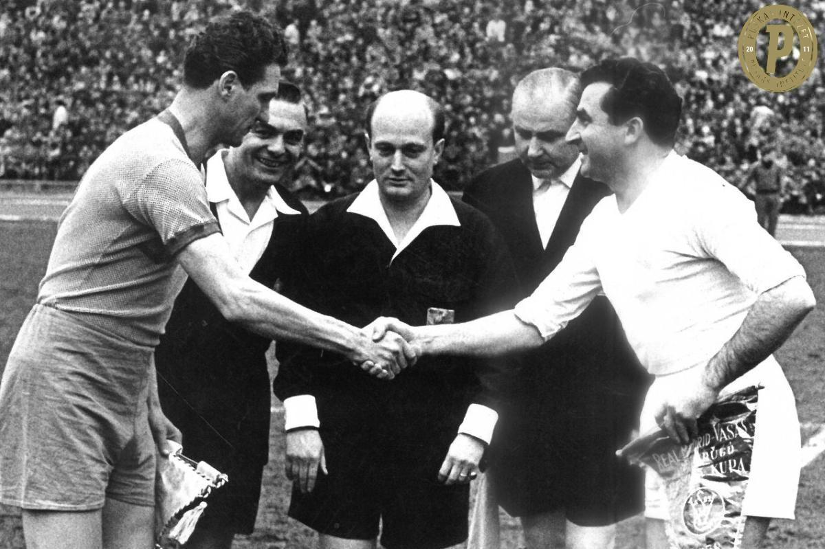Szilágyi Gyula és Miguel Muñoz csapatkapitányok zászlót cserélnek a Népstadionban az 1958. április 16-i Vasas SC–Real Madrid (2–0) BEK-elődöntő visszavágón (fotó: Puskás Intézet)