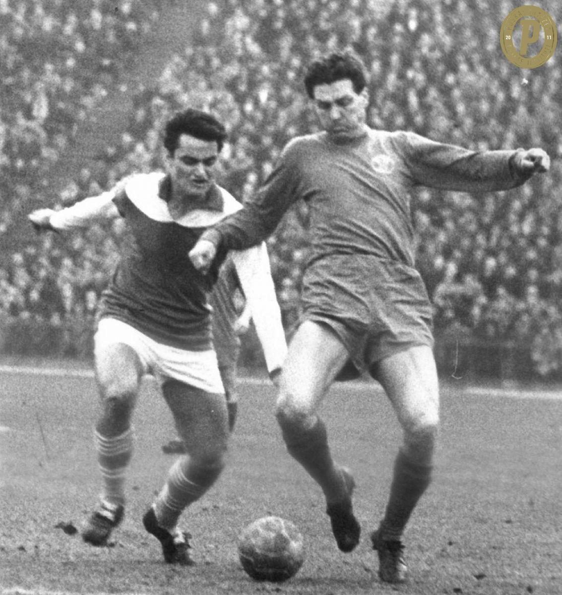 Szilágyi Gyula (jobbra) az 1960. március 13-i Vasas SC–Újpesti Dózsa (3–0) NB I-es mérkőzésen, melyen ő szerezte a harmadik gólt (fotó: Puskás Intézet)