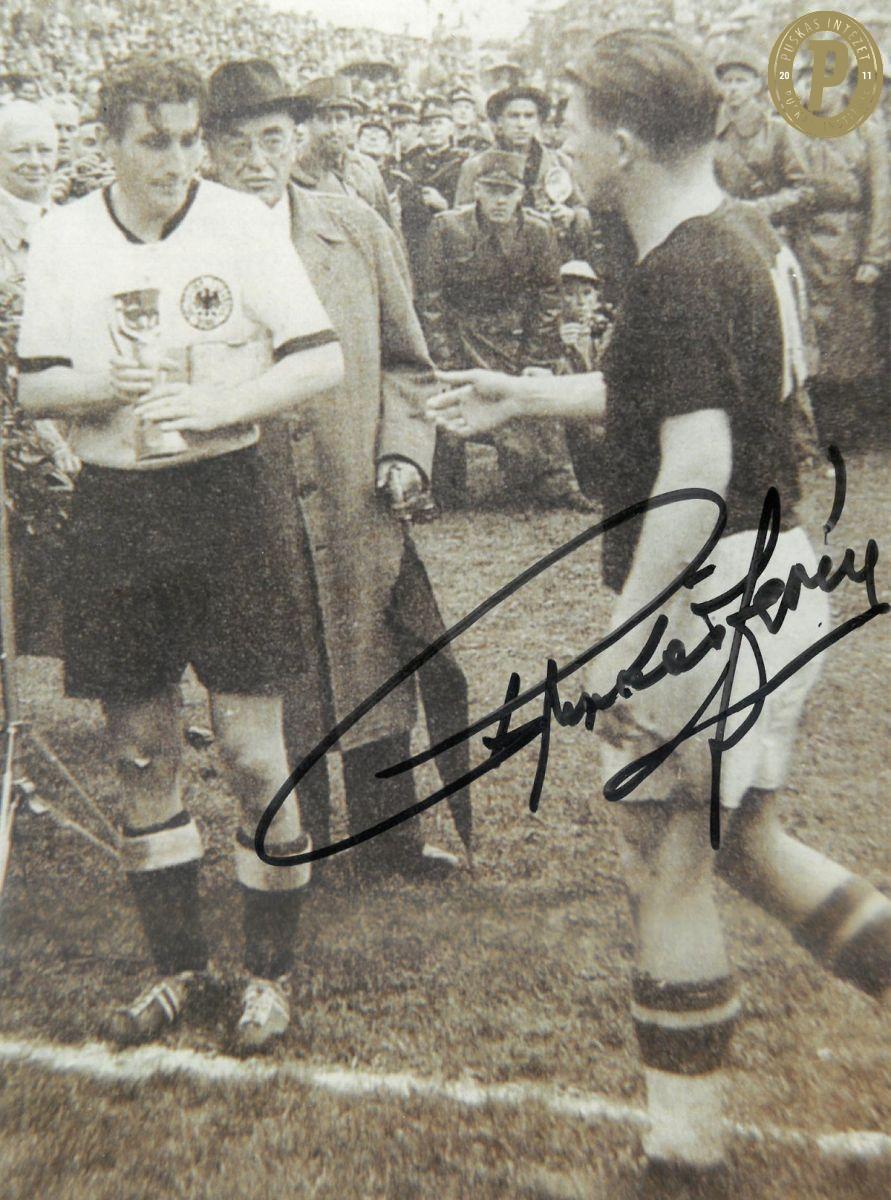 Dedikált fotó, Puskás Ferenc gratulál a világbajnok Fritz Walternak. (Fotó: Puskás Intézet)