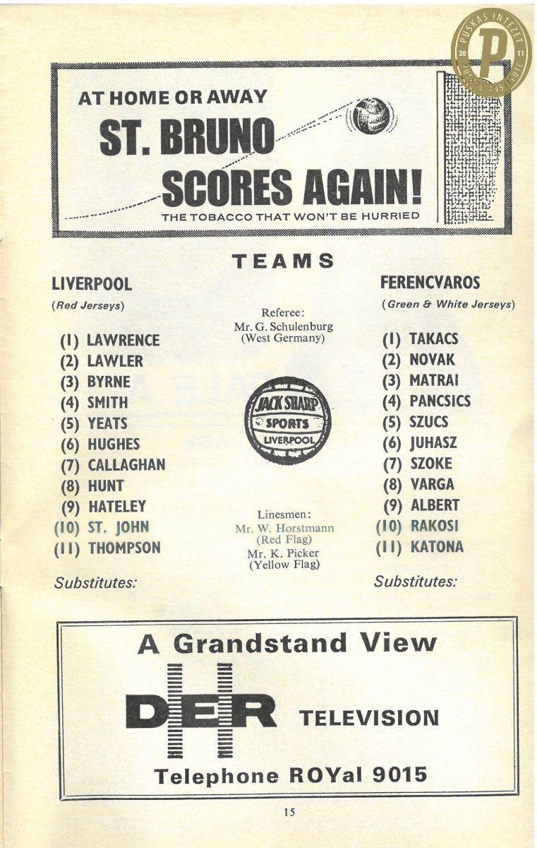 Liverpool: Tommy Lawrence – Chris Lawler, Gerry Byrne, Tommy Smith, Ron Yeats, Emlyn Hughes, Ian Callaghan, Roger Hunt, Strong Geoff, Ian St. John, Peter Thompson. Vezetőedző: Bill Shankly