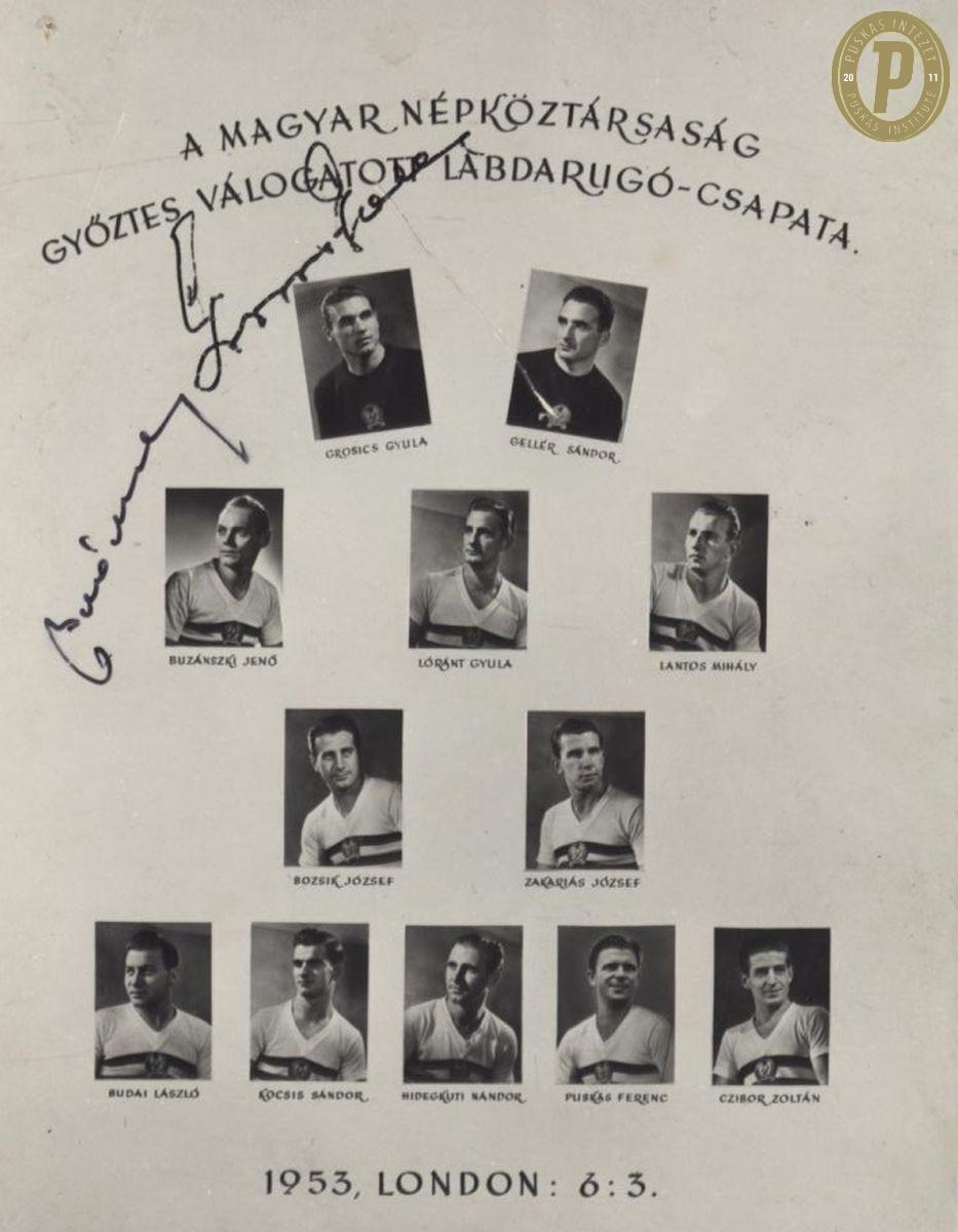 A győztes magyar válogatott tablója Buzánszky Jenő és Grosics Gyula aláírásával. (Fotó: Puskás Intézet)