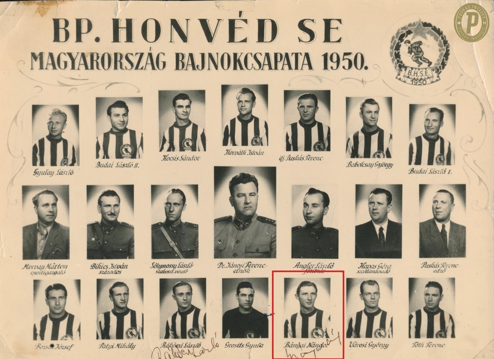 A Bp. Honvéd 1950 őszi bajnokcsapatának tablója – Bányai Nándor aláírásával (fotó: Puskás Intézet)