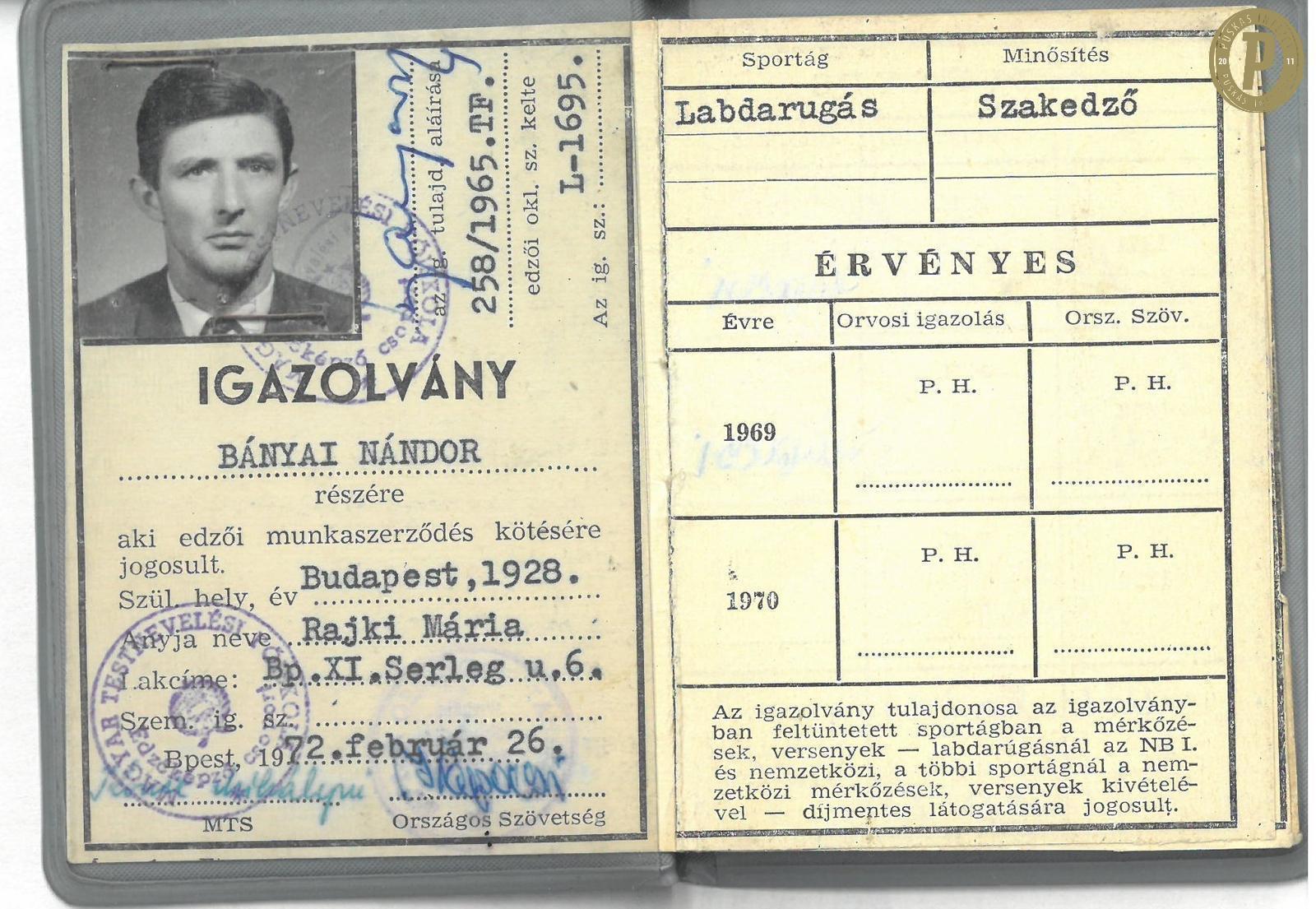 Bányai Nándor edzői igazolványa. (Fotó: Puskás Intézet)