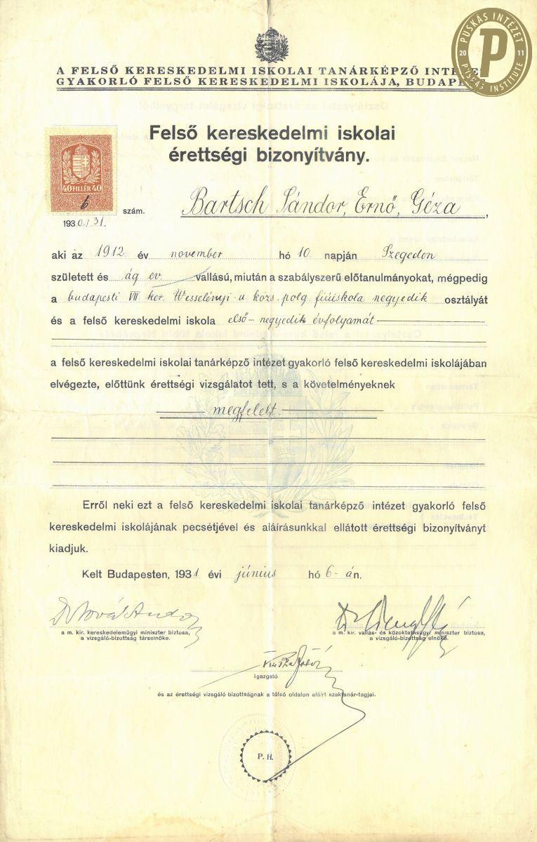 Barcs Sándor érettségi oklevele. (Fotó: Puskás Intézet)
