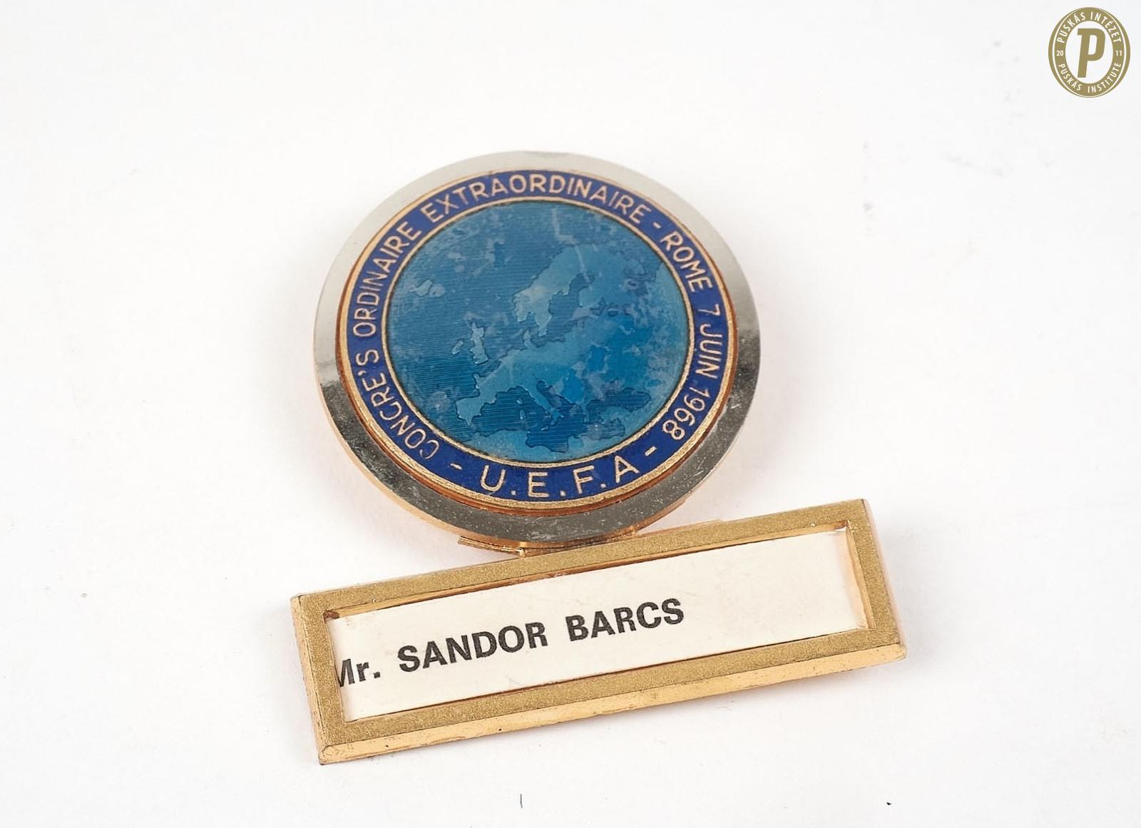 Barcs Sándor 1968-as UEFA Kongresszus kitűzője névtáblával. (Fotó: Puskás Intézet)