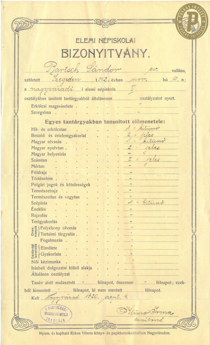 Bartsch Sándor elemi népiskolai bizonyítványa. (Fotó: Puskás Intézet)