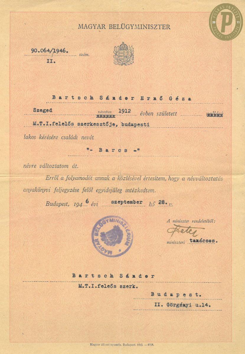 Barcs Sándor névváltoztatásáról szóló dokumentum. (Fotó: Puskás Intézet)