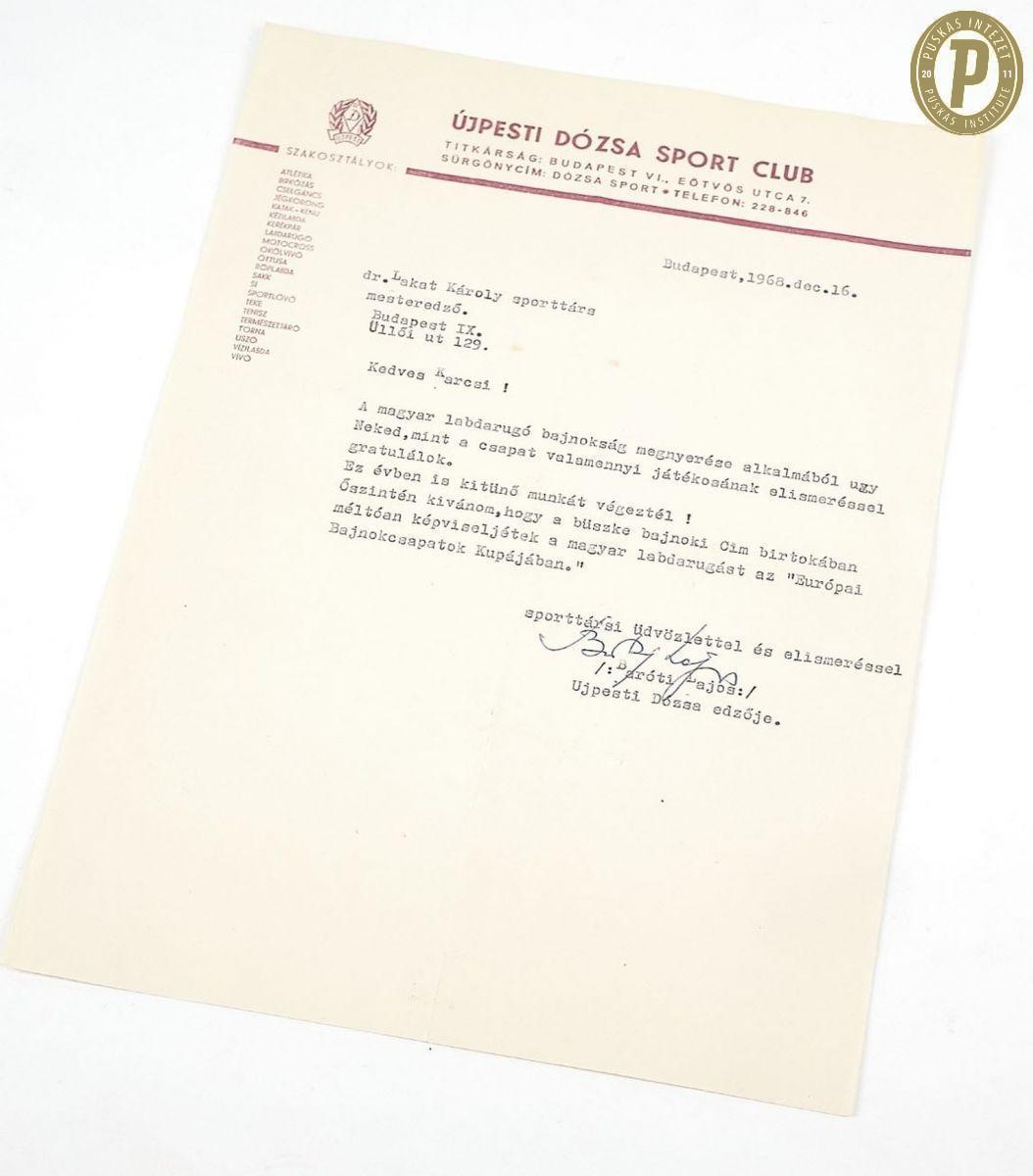 Baróti Lajos gratuláló levele újpesti vezetőedzőként a Ferencváros magyar bajnok szakvezetőjének, Lakat Károlynak, 1968. (Fotó: Puskás Intézet)