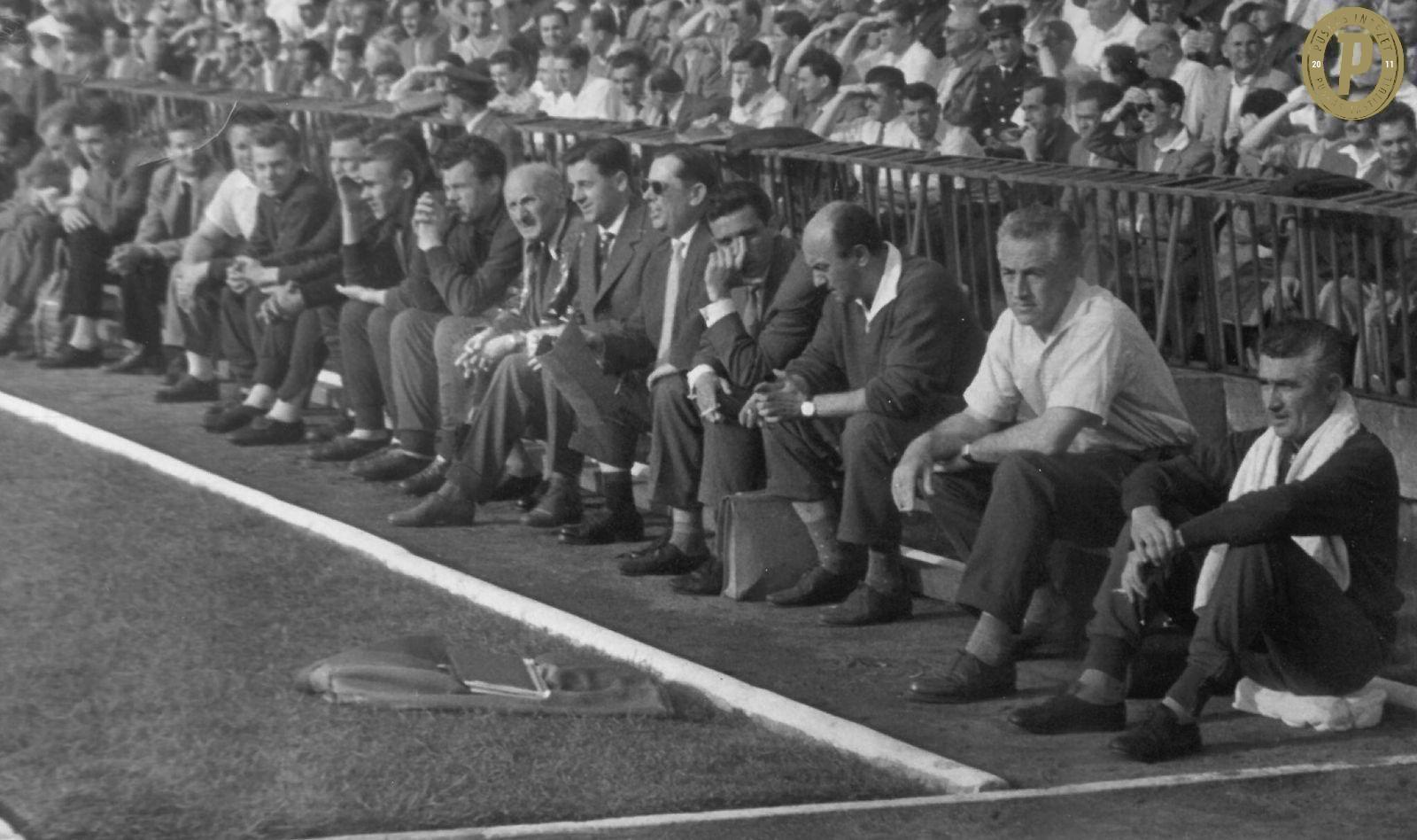 Baróti Lajos (jobbról a második, fehér ingben) a magyar labdarúgó-válogatott kispadján, az 1960. május 22-i Magyarország – Anglia (2–0) barátságos mérkőzésen (fotó Puskás Intézet)