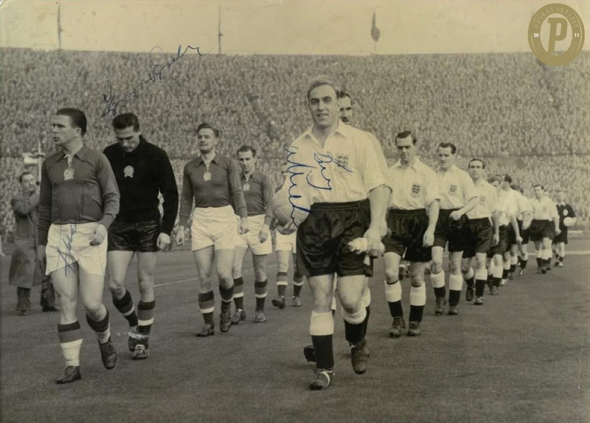 A dedikált fotón Puskás Ferenc és Billy Wright vezetik ki a csapatokat az „évszázad mérkőzésén” a Wembley Stadionban. (Fotó: Puskás Intézet)