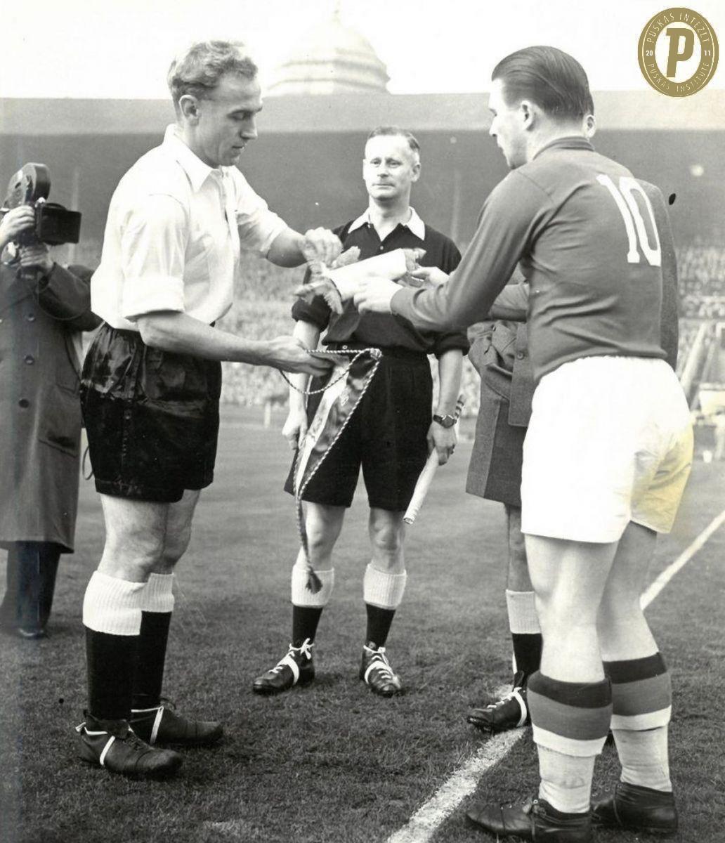 Billy Wright és Puskás Ferenc zászlót cserél a legendás 6–3 előtt. (Fotó: Puskás Intézet)