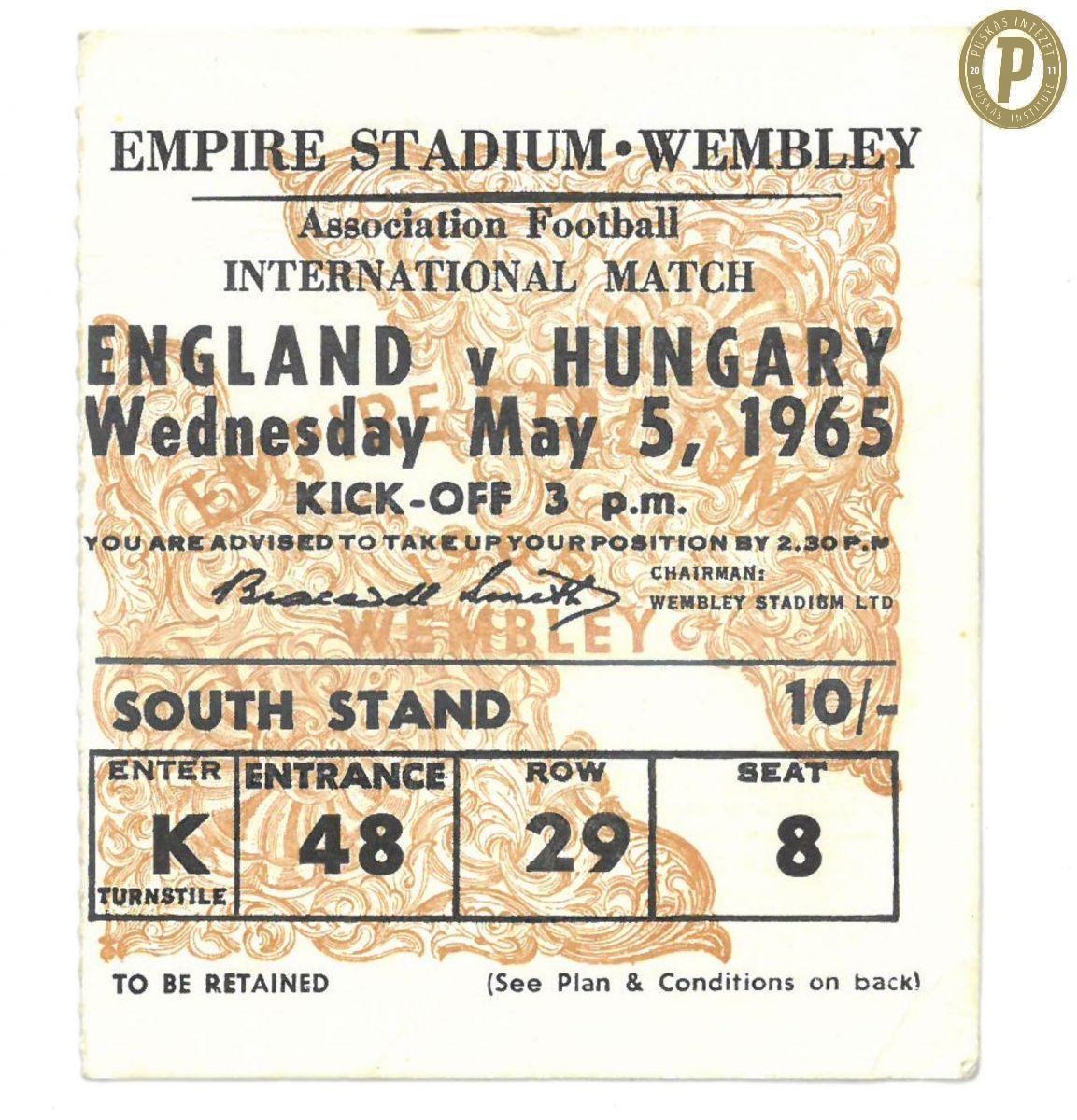 Belépőjegy az 1965-ös Anglia – Magyarország (1–0) barátságos mérkőzésre. Ezen a találkozón mutatkozott be a magyar válogatottban Gelei József. (Fotó: Puskás Intézet)