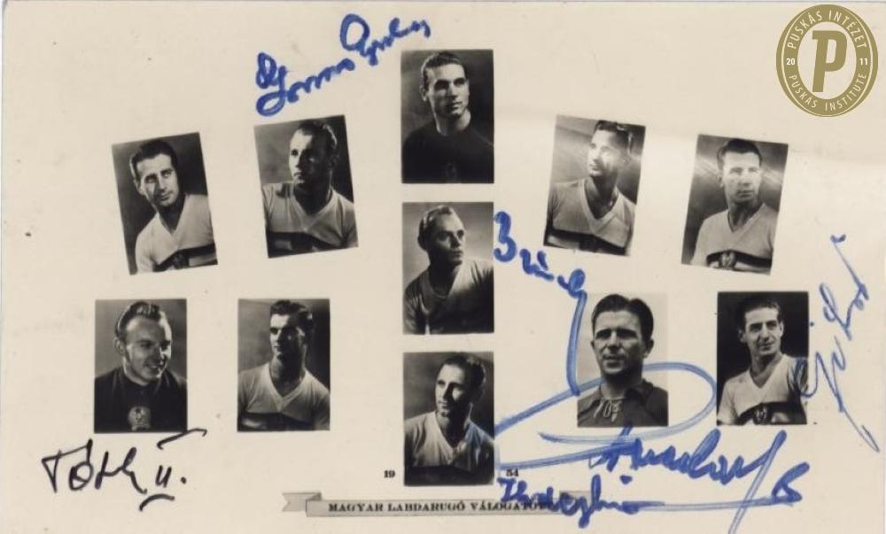 A magyar labdarúgó-válogatott tablója Buzánszky Czibor Zoltán, Gosics Gyula, Hidegkuti Nándor, Puskás Ferenc és Tóth II József aláírásával, 1954. (Fotó: Puskás Intézet/Puskás-hagyaték)
