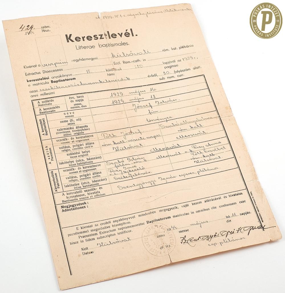 Tóth II. József keresztlevelének hiteles másolata, 1944. (Fotó: Puskás Intézet/Tóth II-hagyaték)
