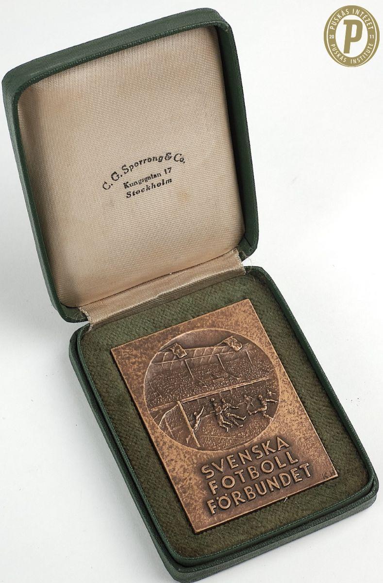 Budai II László emlékplakettje az 1949. június 19-i Svédország–Magyarország (2–2) barátságos mérkőzésről, a játékos ezen a találkozó volt először eredményes válogatottban (fotók: Puskás Intézet/Budai II-hagyaték)