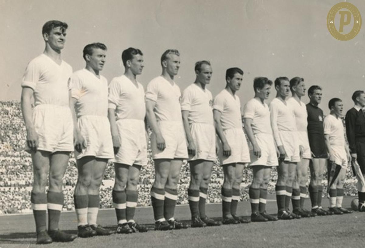 Budai II László (balról a második) a magyar válogatott kezdőcsapatában, amely 1953. május 17-én 3–0-ra legyőzte Olaszországot a római Olimpiai Stadion megnyitója, s így megnyerte az 1948–1953-as Európa-kupát (fotó: Puskás Intézet)