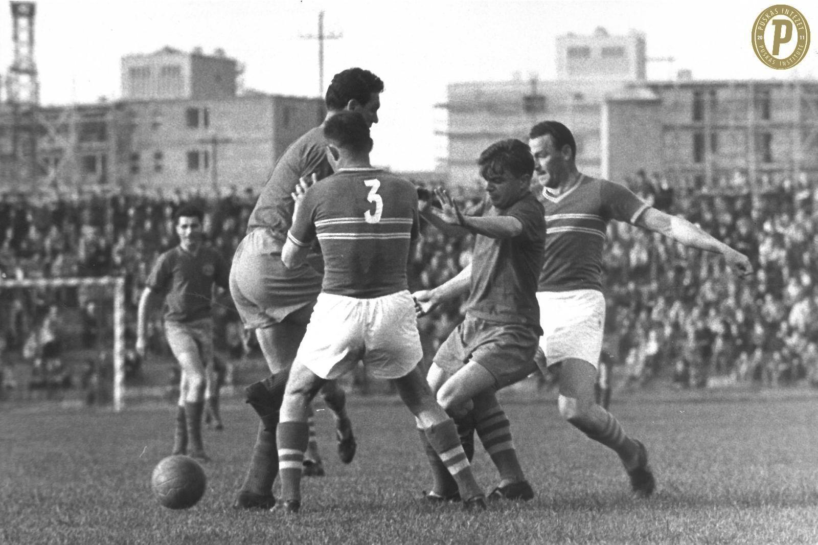 Csordás Lajos a védők gyűrűjében a Vasas – BVSC bajnokin. (Fotó: Puskás Intézet)