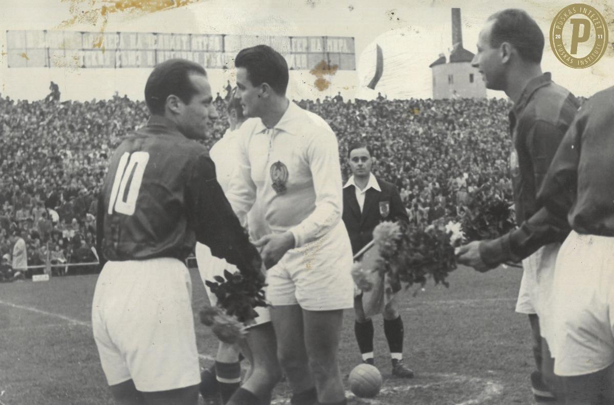 Deák Ferenc (balra) belövi csapata második gólját az 1946. október 20-i Szentlőrinci AC–Szombathelyi Haladás (6–0) NB I-es bajnokin (fotó: Puskás Intézet/Deák-hagyaték)