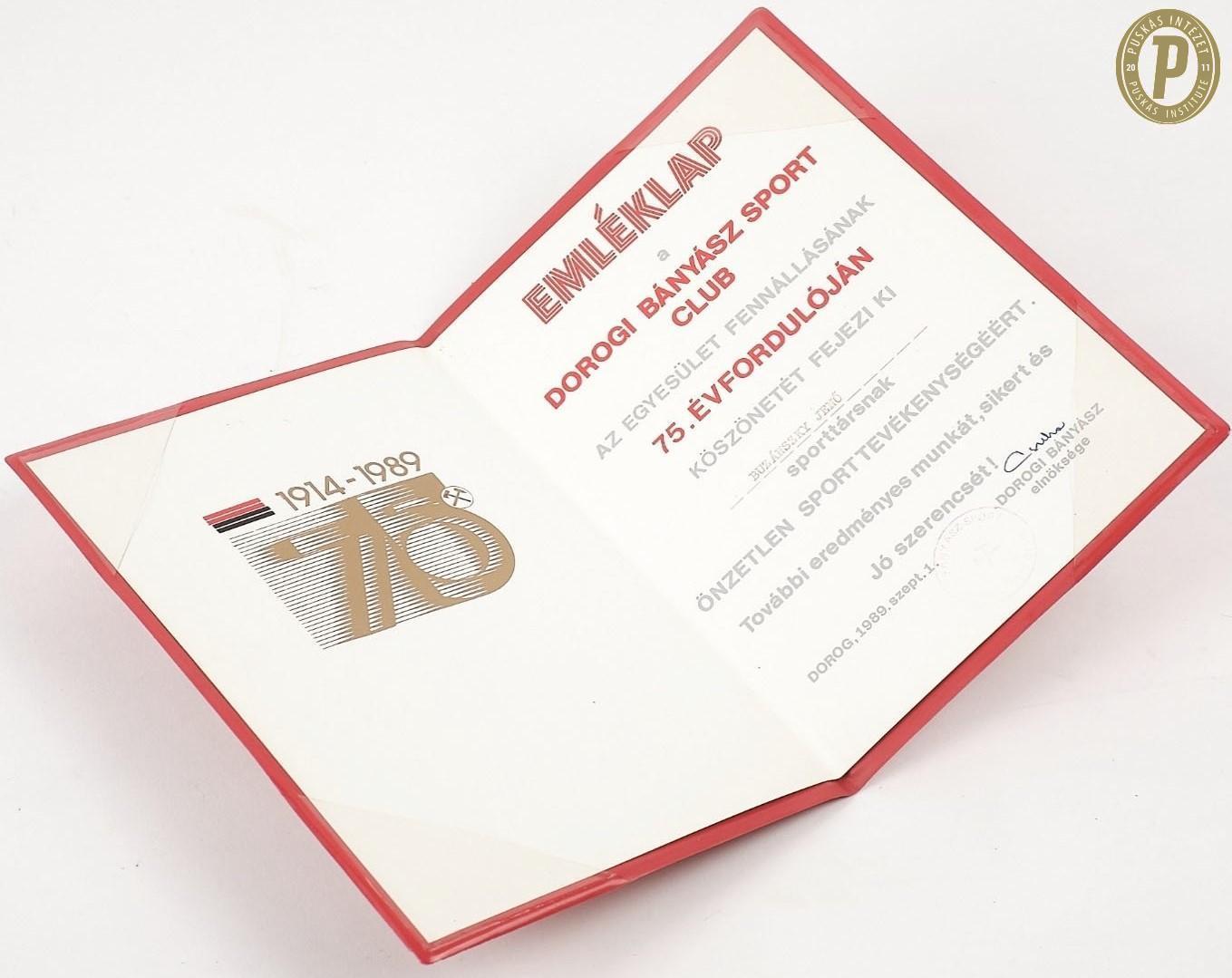 Buzánszky Jenő oklevele, amelyet a Dorogi Bányász megalakulásának 75. évfordulójára kapott (fotó: Puskás Intézet/Buzánszky-hagyaték)