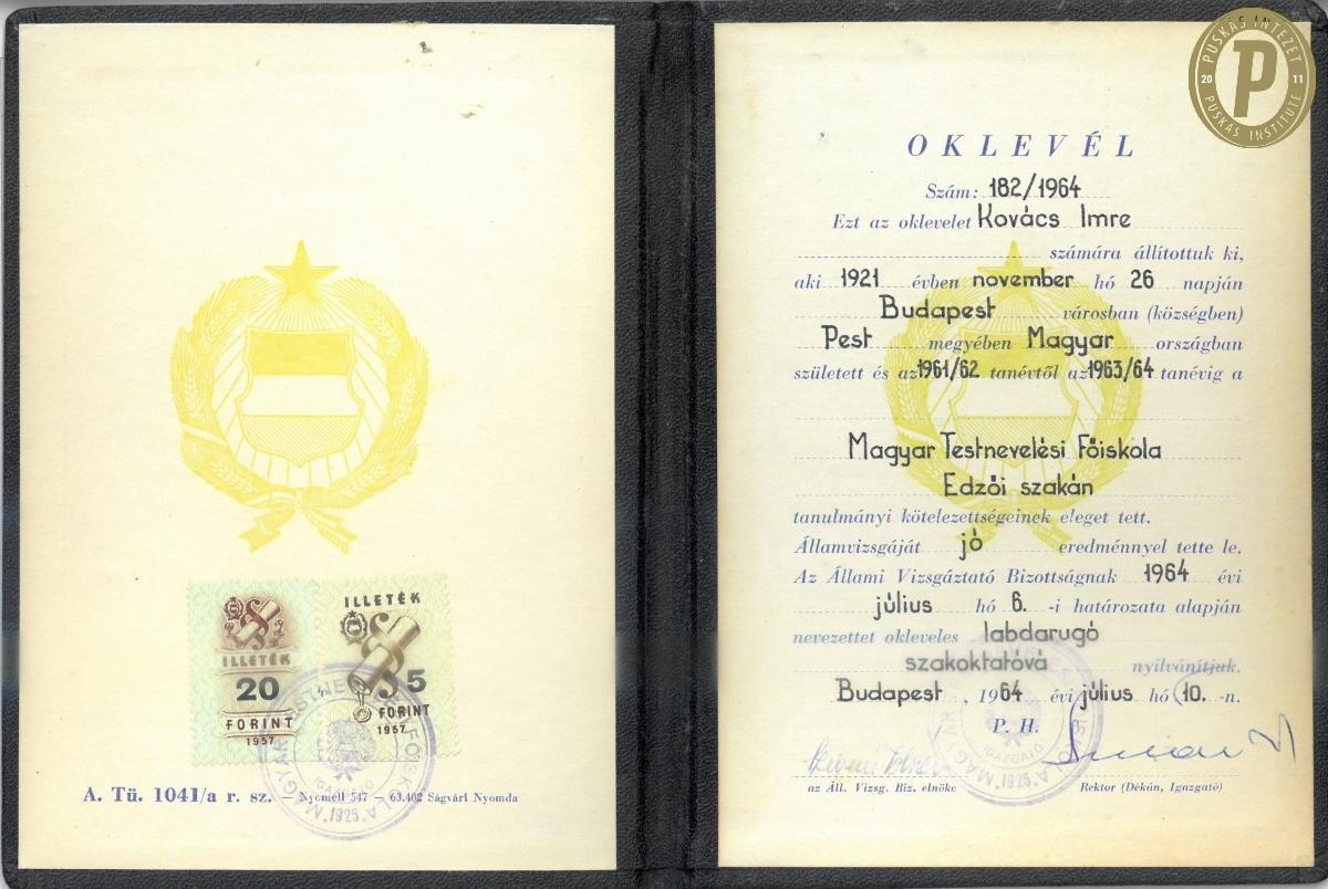 Kovács Imre edzői oklevele (fotó: Puskás Intézet)