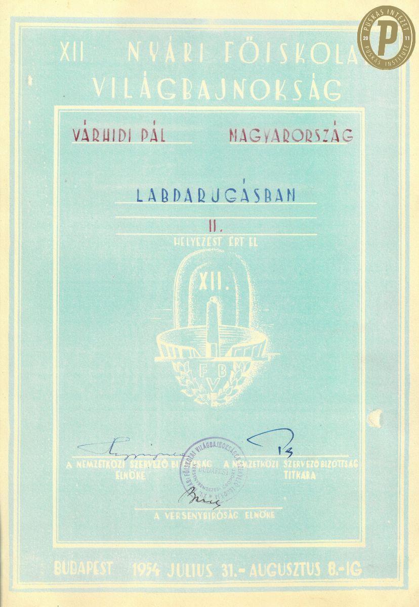 Várhidi Pál oklevele az 1954-es Nyári Főiskolai Világbajnokságról. (Fotó: Puskás Intézet)