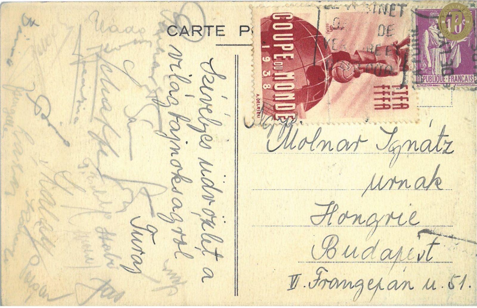 A magyar játékosok által aláírt képeslap a franciaországi vb-ről. (Fotó: Puskás Intézet)