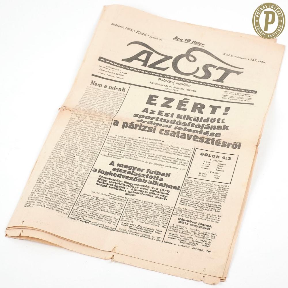 Az Est c. újság címlapja az 1938-as vb-döntőről (fotó: Puskás Intézet)