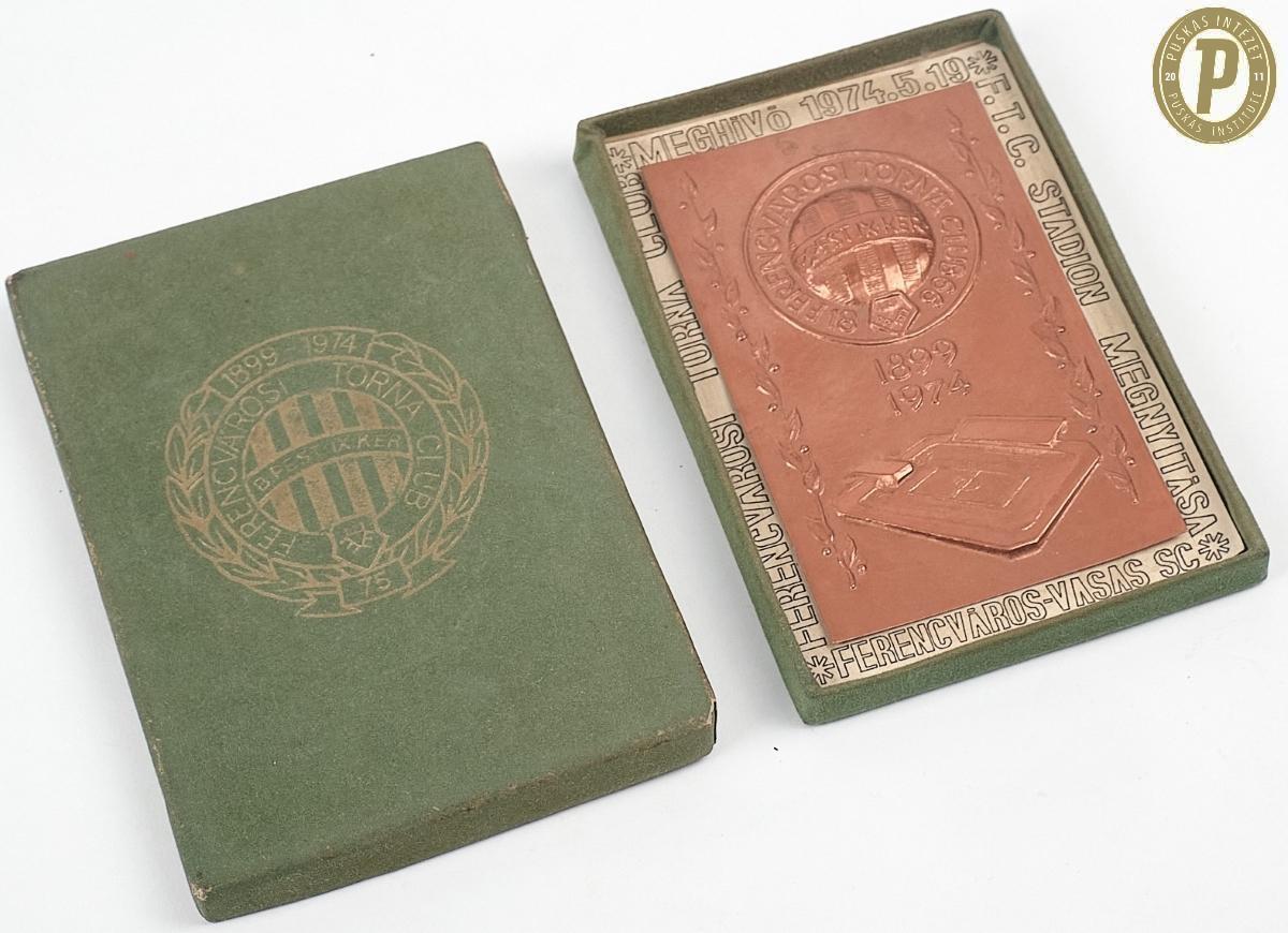 Az 1974. május 19-i Ferencvárosi TC–Vasas SC (0–1) Üllői úti stadion avatójának az emlékplakettje, a mérkőzést az FTC alapításának 75. évfordulóján játszották (fotó: Puskás Intézet)