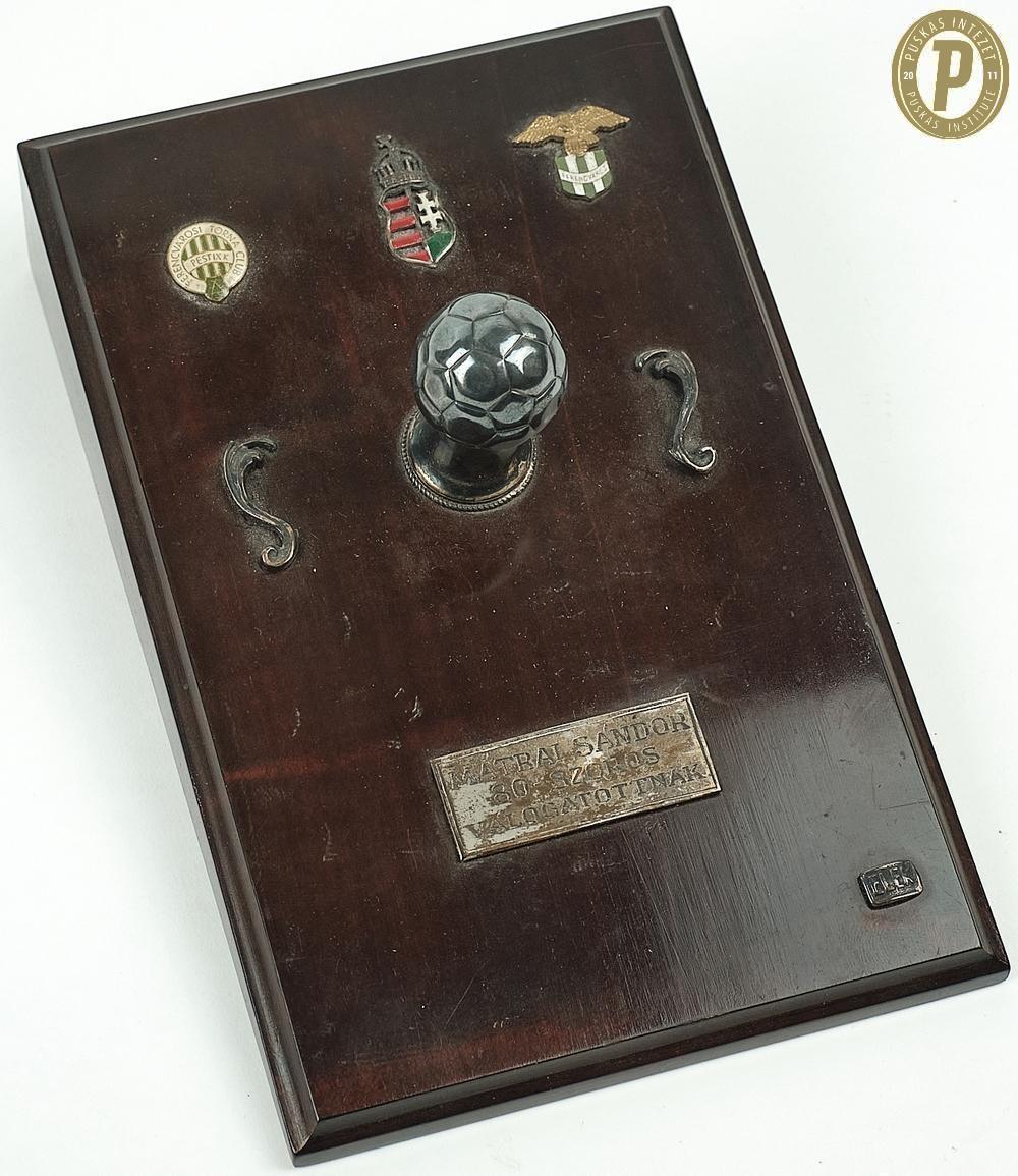 Mátrai Sándor 80. válogatottságára kapott emlékplakett (fotó: Puskás Intézet)