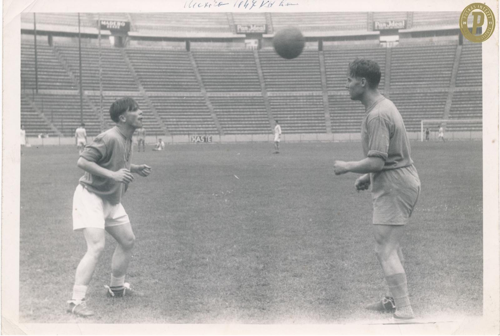 Puskás Ferenc és Sárosi György fejelget a Ferencváros 1947-es mexikói túrájának egyik edzésén (fotó: Puskás Intézet/Puskás-hagyaték)