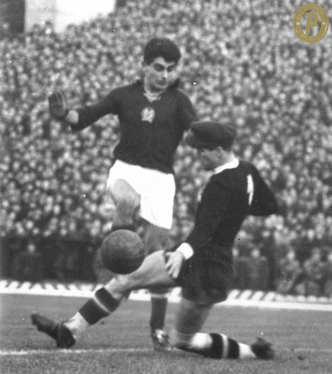 Fenyvesi Máté próbál túljárni az osztrák Kirt Scmhied kapus eszén az 1954. november 14-i Magyarország – Ausztria (4–1) barátságos mérkőzésen. (Fotó: Puskás Intézet)