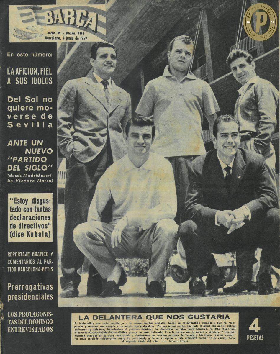 A barcelonai újság címlapján: Kubala László, Czibor Zoltán, Kocsis Sándor és Luis Suárez. (Fotó: Puskás Intézet/Kubala-hagyaték)