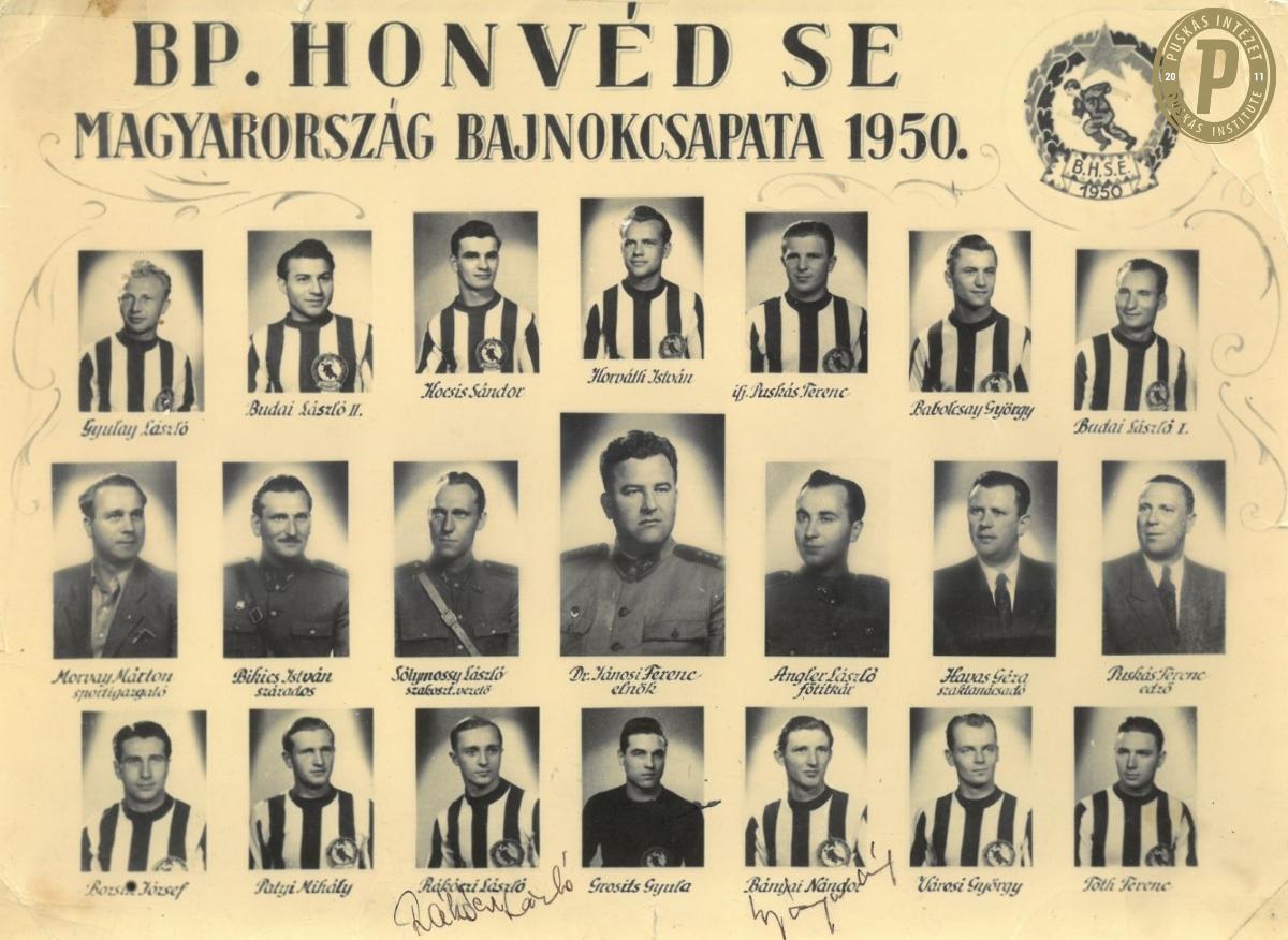 A Bp. Honvéd 1950 őszi bajnokcsapatának tablója – Rákóczi László és Bányai Nándor aláírásával. (Fotó: Puskás Intézet)