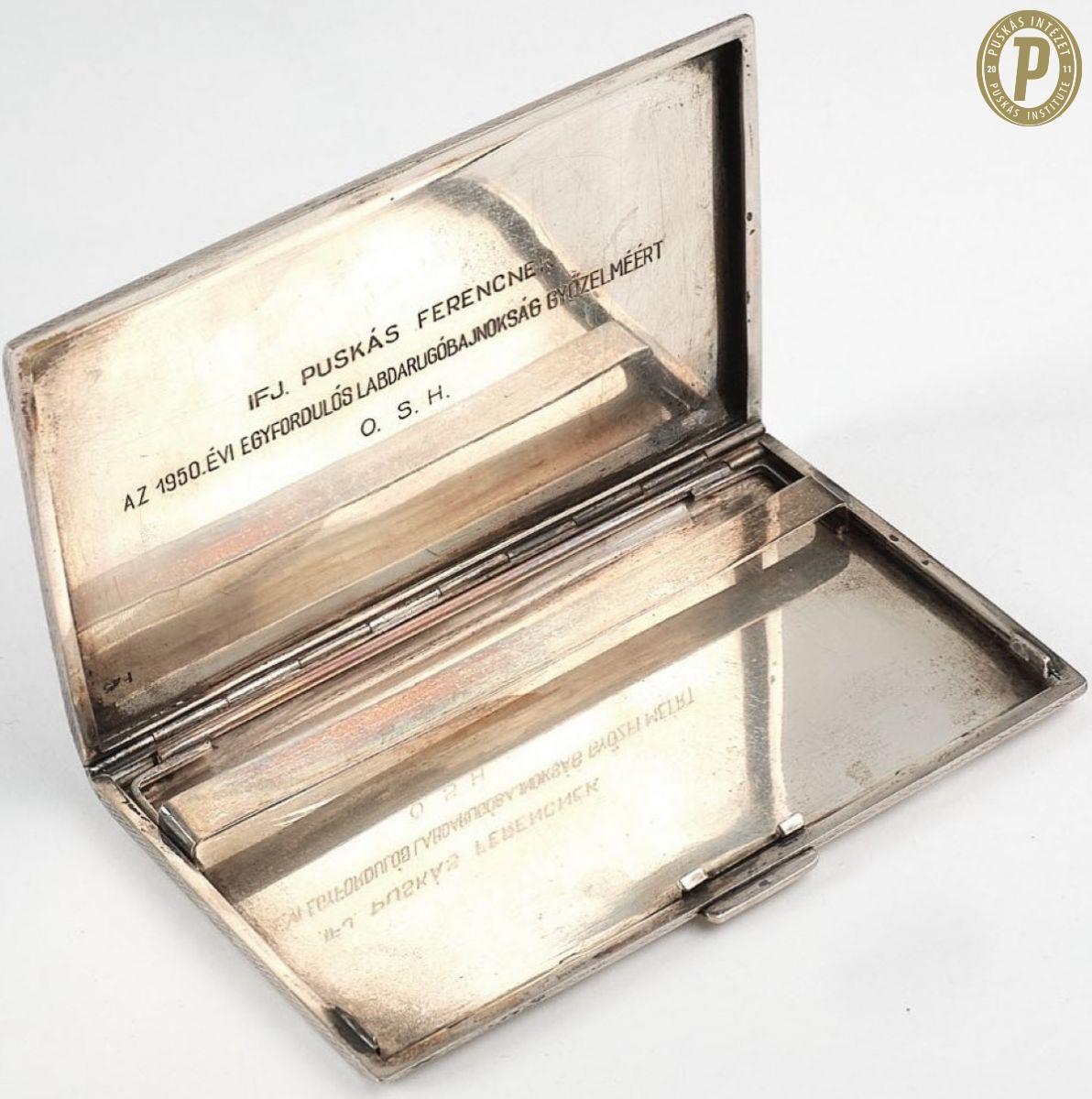 Puskás Ferenc cigarettatárcája, amelyet az Országos Sporthivataltól (OSH) kapott a bajnoki elsőségért. (Fotó: Puskás Intézet/Puskás-hagyaték)