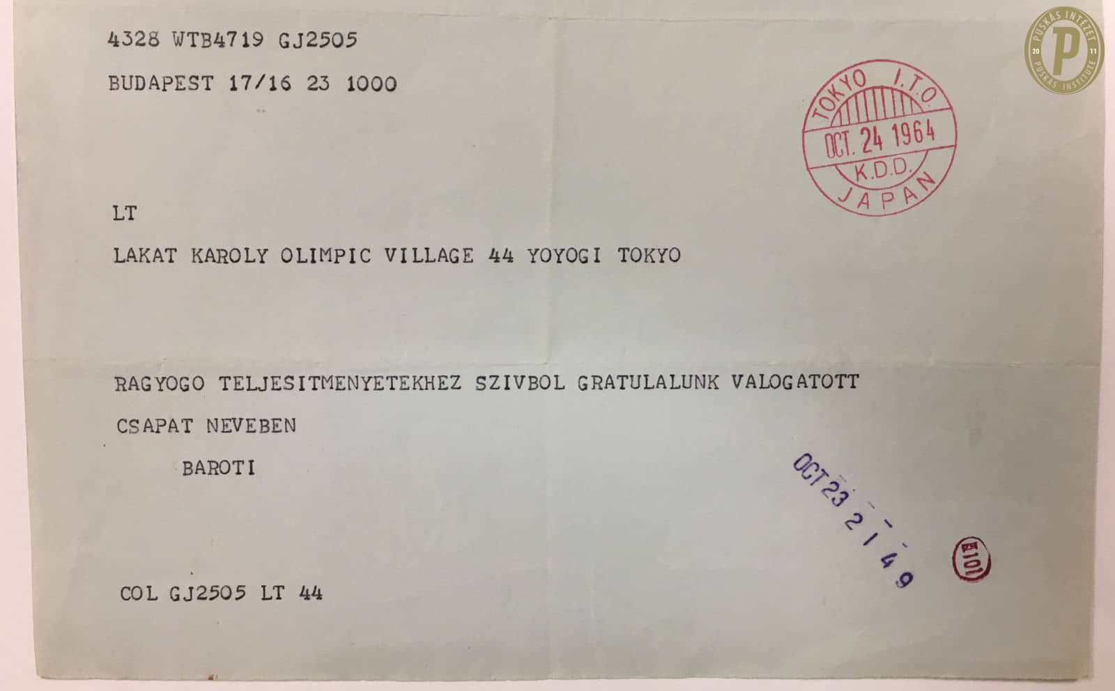 Baróti Lajos gratuláló távirata Lakat Károlynak az 1964-es olimpia után (Lakat-hagyaték/ Puskás Intézet)