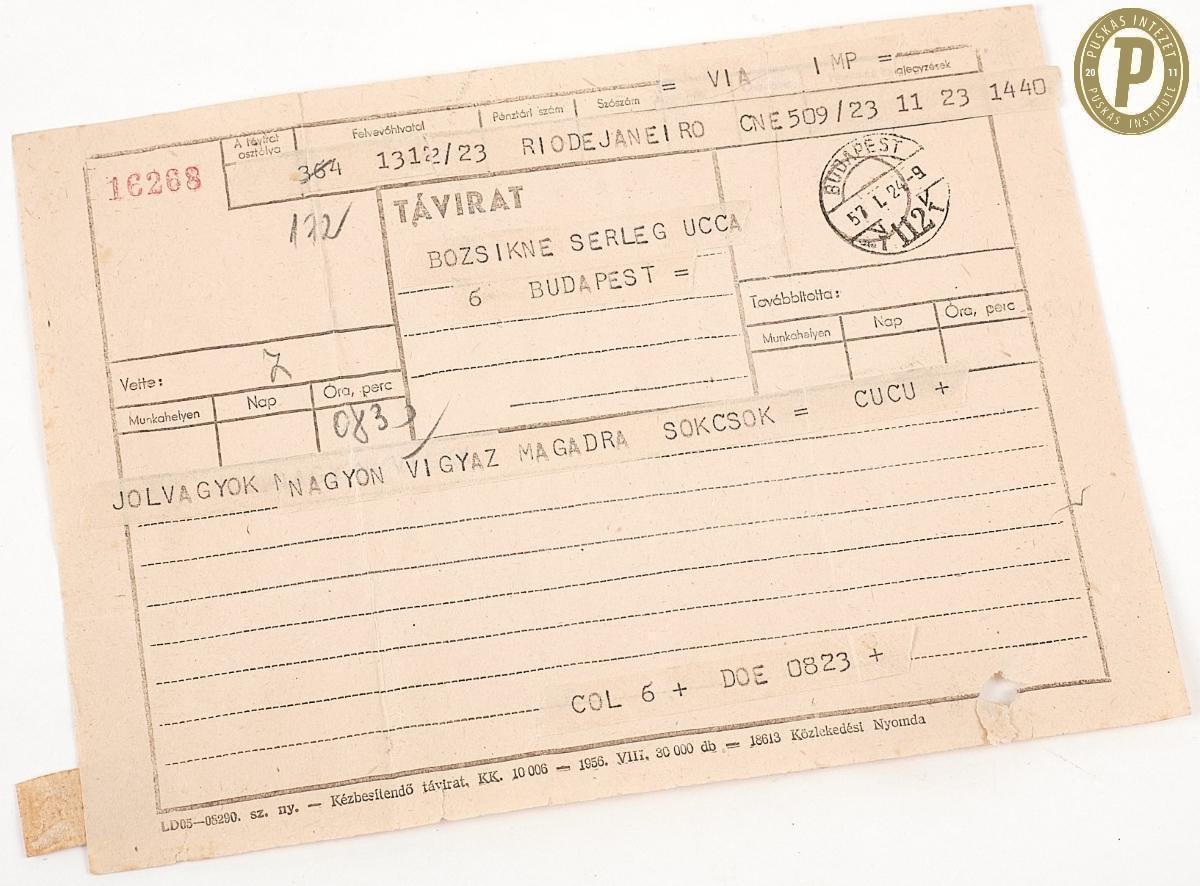 Bozsik József távirata a Bp. Honvéd dél-amerikai túrájáról a feleségének (fotó: Puskás Intézet/Bozsik-hagyaték)