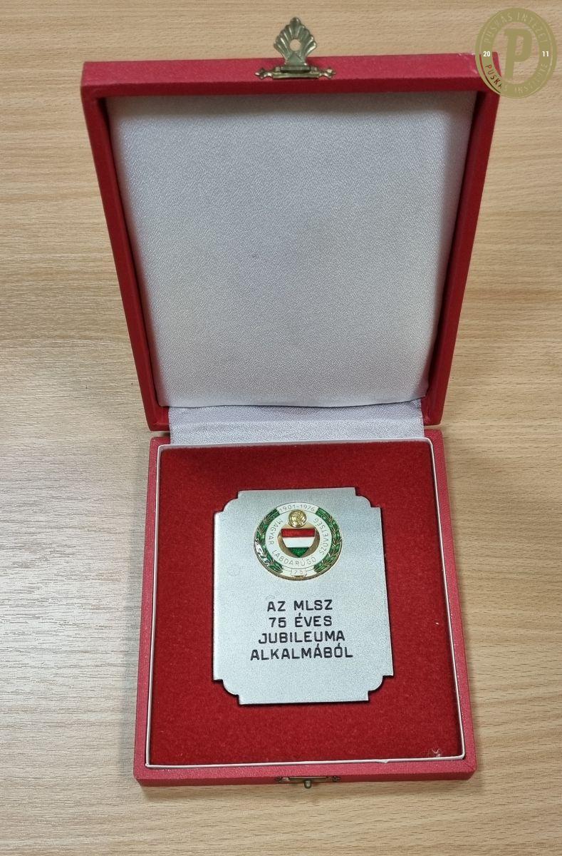 Mátrai Sándor Magyar Labdarúgó-szövetségtől (MLSZ-től) kapott emlékplakettje. (Fotó: Puskás Intézet)